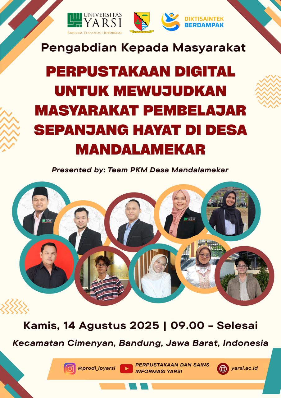 Universitas YARSI melalui Pusat YARSI Empowerment Village akan melaksanakan kegiatan Pengabdian kepada Masyarakat (PkM) dengan tema “Perpustakaan Digital untuk Mewujudkan Masyarakat Pembelajar Sepanjang Hayat di Desa Mandalamekar”. Kegiatan ini merupakan wujud nyata komitmen Universitas YARSI dalam mendukung peningkatan literasi dan pembelajaran sepanjang hayat di masyarakat.